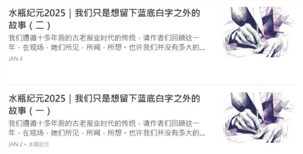 The independent Chinese-language media outlet Mangmang (莽莽) wrote New Year’s messages in 2023 and 2024, but stopped in 2025. Another independent media outlet, Aquarius Era (水瓶纪元), welcomed 2026 in the form of reporters’ reviews under the title “Stories Beyond Blue Backgrounds and White Text” (留下蓝底白字之外的故事), a reference to the simple factual bulletins so often released in recent years by police and government offices and shared by news outlets in lieu of actual journalism. The editor’s note at the beginning read: “Our thinking is simple: since things are important, we go to the scene; since we are at the scene, we don’t want to castrate or whitewash the facts in any way. . . . This country has such a large population, yet the stories being told are becoming fewer and fewer. There are still many such moments that show us journalism still matters.”