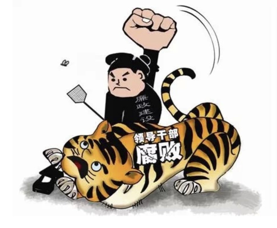 A cartoon from 2014, issued by the official Xinhua News Agency, shows an official with a large fist and a fly swatter attacking a tiger labelled “official corruption.”